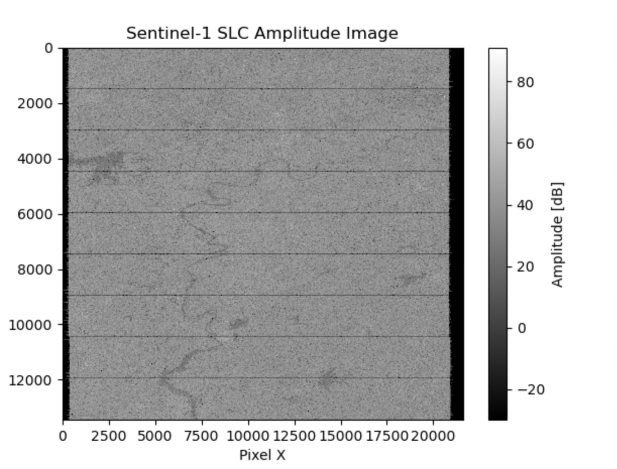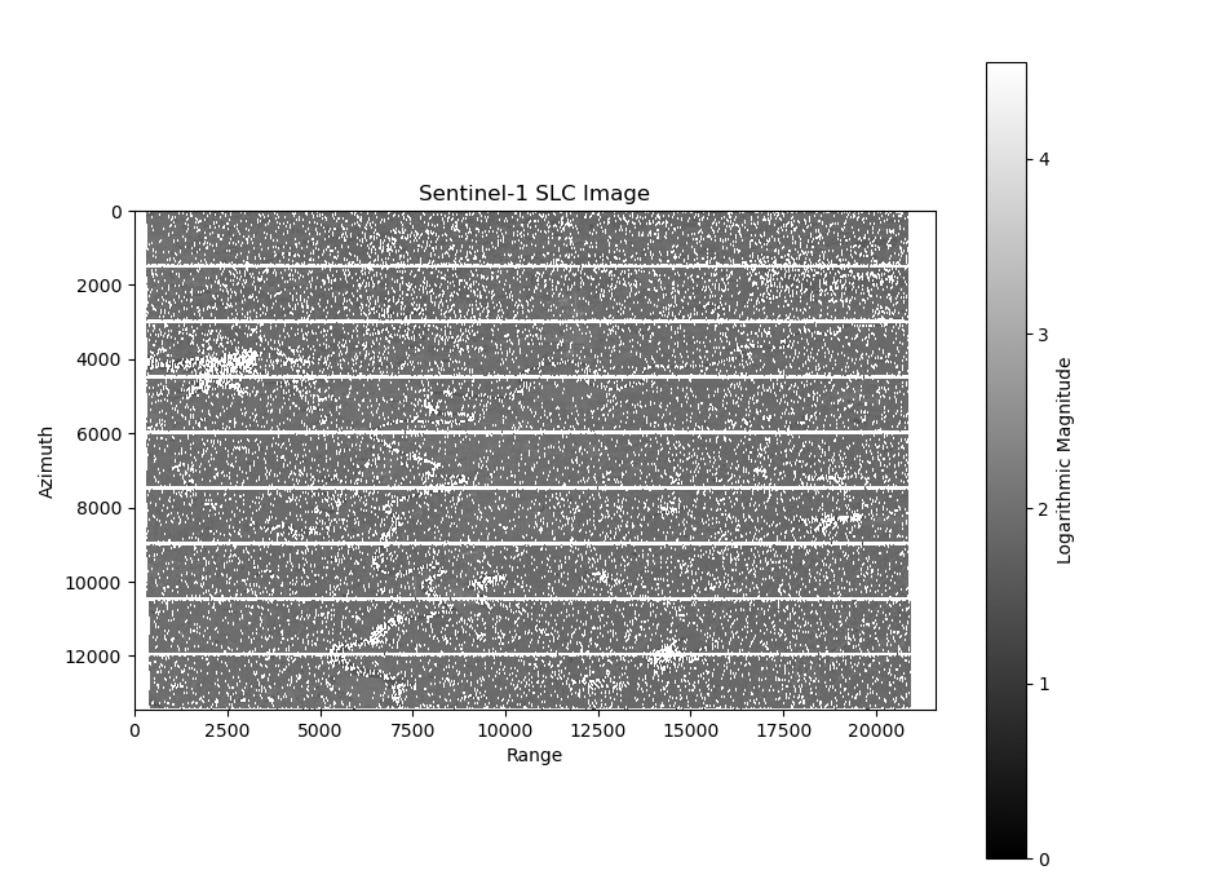 This example focuses on visualizing the amplitude of the signal, which is a common approach when working with radar imagery. However, depending on your analysis goals, you might be interested in other properties of the signal such as phase information, in which case you would need to adjust the visualization approach accordingly.