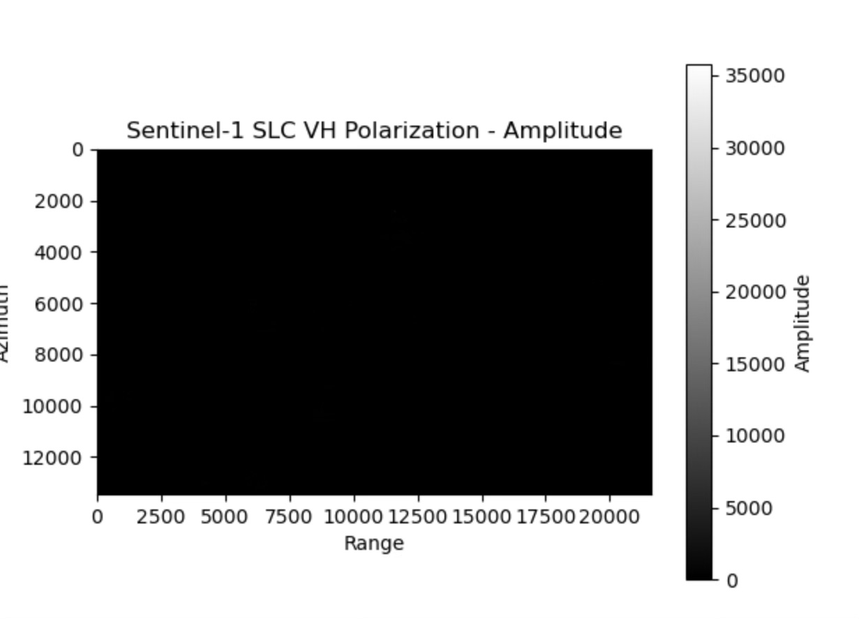 This code example focuses on loading and visualizing the image data using basic plotting. Depending on your specific needs, you might want to process the image data further (e.g., applying calibration, speckle filtering, or terrain correction algorithms) before visualization or analysis.> OK, this works. But, the displayed image is all black.hen you encounter an all-black image upon visualization, especially with SAR (Synthetic Aperture Radar) data like Sentinel-1 SLC images, it's often due to the high dynamic range of the radar amplitude data. Radar images can contain a few very bright pixels (e.g., from strong reflectors like buildings or metal structures) alongside many dark pixels (from low-reflectivity areas like water or vegetation). When plotted directly, the contrast is so high that most of the image appears black due to the majority of pixels having low amplitude values in comparison to the few very bright ones.